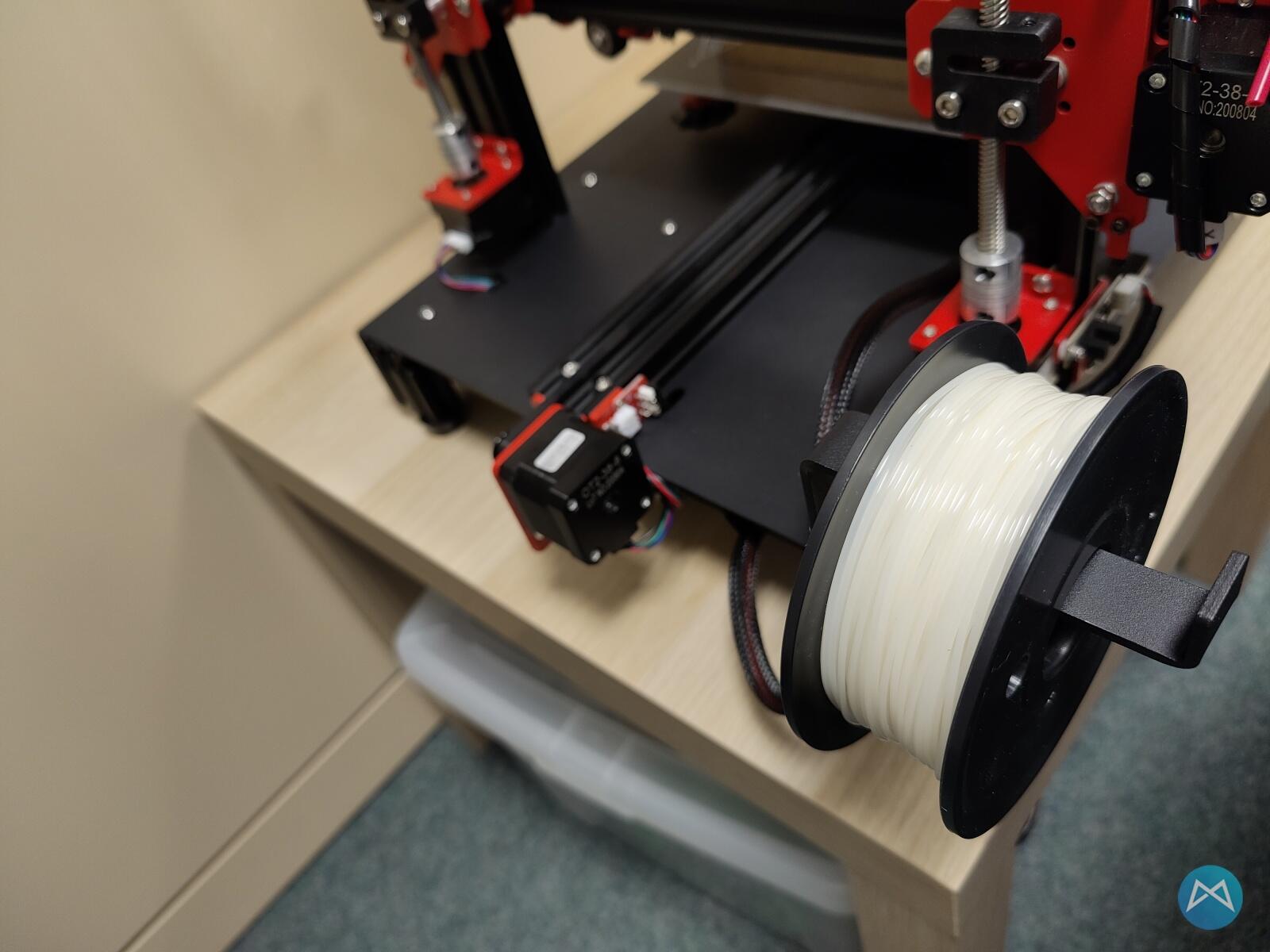 Hinten links am Gerät wird der mitgelieferte Filamentrollenhalter angeschraubt. Von der Größe her sollten dort die gängigsten Rollen drauf passen. Diese 2kg-Dinger dürften eventuell knapp werden. Aber die nutzt ja auch nicht jeder zu Hause.