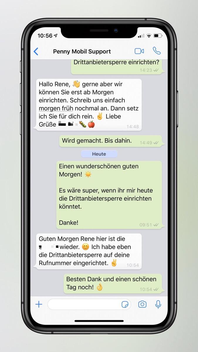 Die erste konkrete Supporterfahrung bei Penny Mobil war auch gut. Ich mag ja Support per Messenger bzw. Chat sehr. In dem Fall habe ich den Support von Penny Mobil über WhatsApp angeschrieben, um die Drittanbietersperre einrichten zu lassen.