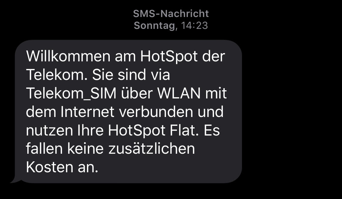 Auch loggte sich mein Smartphone kürzlich in einen Hotspot namens „Telekom_SIM“ ein, wozu ich dann noch eine SMS erhielt, die offensichtlich nicht zu meinem Tarif passte, in dem es keine HotSpot-Flat gibt.