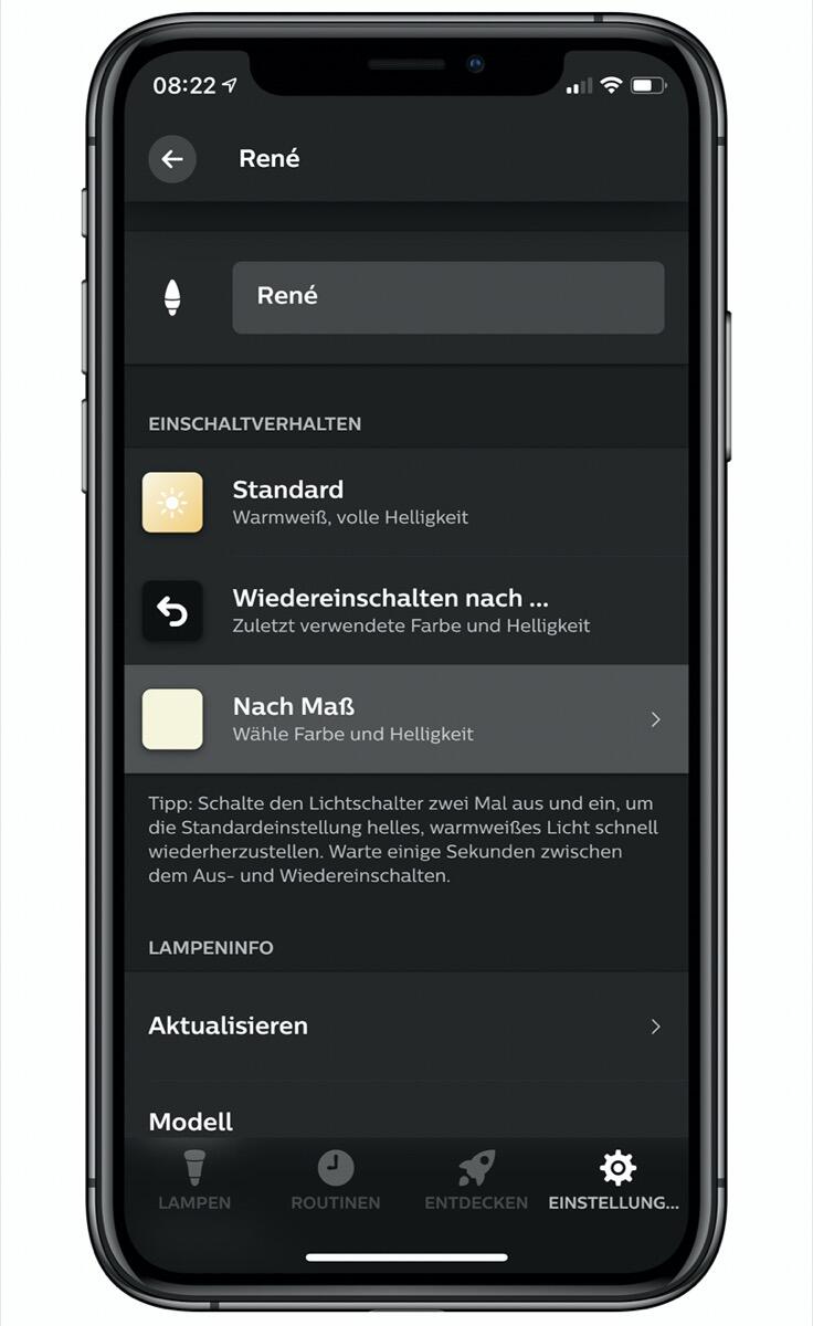 Außerdem kann in der Philips Hue Bluetooth App festgelegt werden, welche Vorsteinstellungen die Lampen haben sollen, wenn sie eingeschaltet bzw. mit Strom versorgt werden. Das ist nicht unwichtig, denn beide Lampen sollten noch über den normalen Schalter nutzbar sein und dabei aber immer nur mit 50 Prozent Helligkeit starten.