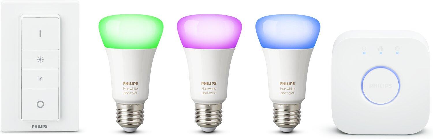 Aktuell gibt es das Starterset von Philips Hue mit drei farbigen E27-Lampen für 129 Euro. Mit dabei ist auch eine Bridge und ein Dimmschalter.