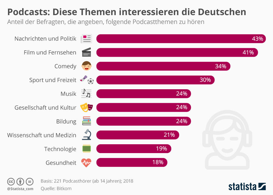 Podcasts sind im Trend, doch welche Themen mögen die Deutschen eigentlich im Alltag? Hier gibt es mal wieder eine aktuelle Umfrage mit Grafik.