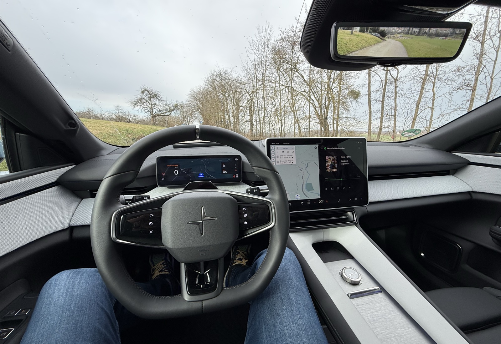 • Was ich nicht unbedingt über den Rückspiegel im Polestar 4 sagen kann, denn es gibt keine Heckscheibe und dafür eine Kamera und ein Display oben in der Mitte. Finde ich bei Seitenspiegeln schon schlecht, ist bei einem Rückspiegel nicht anders. Die Kamera ist gut und das Display scharf, aber für mich war die Übersicht im Alltag schlechter und die Augen müssen sich ganz kurz auf das Display fokussieren, weil es bei mir sehr nah an den Augen ist. Das lenkt zu sehr von der Straße ab.