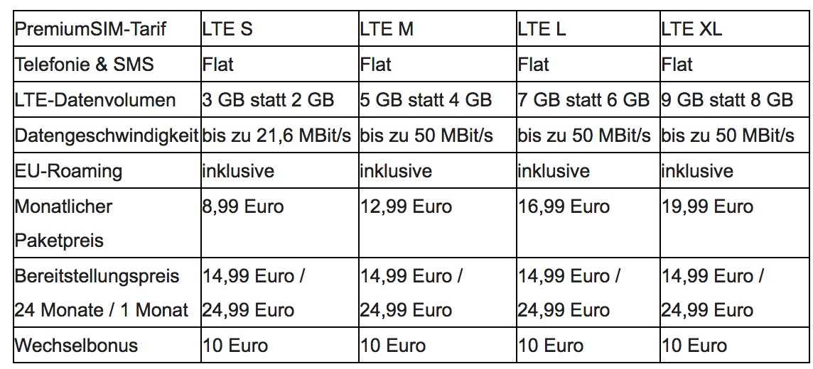 Alle vier LTE-Tarife (Telefónica-Netz) erhalten ab sofort ohne Aufpreis 1 GB mehr Internetvolumen. Das Upgrade gilt dabei für beide Laufzeitvarianten (monatlich kündbar und 24 Monate) gleichermaßen. Für 8,99 Euro monatlich stehen somit jetzt beispielsweise im PremiumSIM-Tarif LTE S 3 GB statt bisher 2 GB für die mobile Internetnutzung bereit.