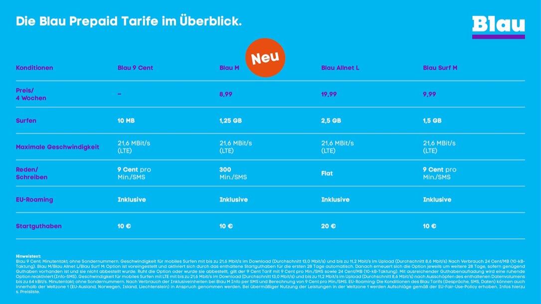 Kunden können die Blau Prepaid-Karten (Starterset UVP: 9,99 Euro) online auf der Blau-Website, im Fachhandel, in Supermärkten oder Drogerien erwerben. Nach der Online-Registrierung werden 10-Euro-Startguthabens aktiviert.