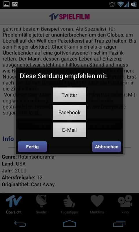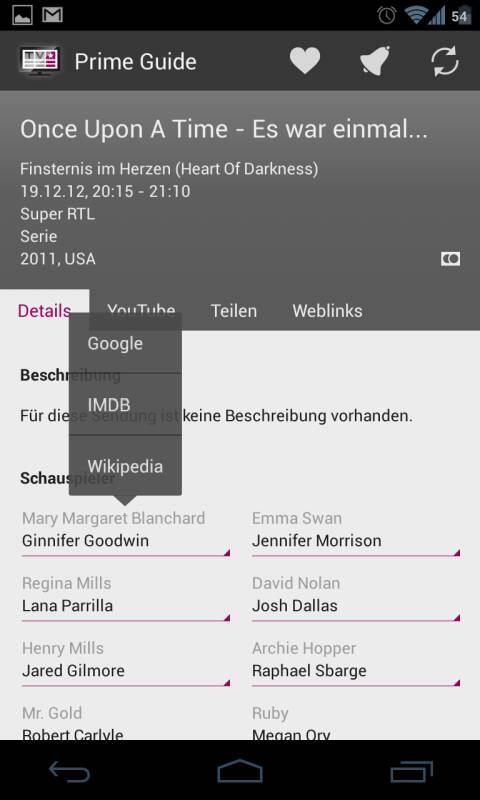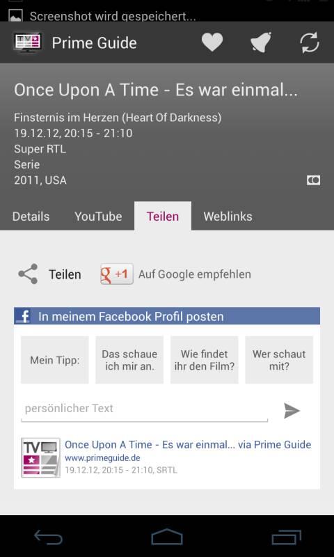 Das Design entspricht den Holo-Richtlinien, ist an Smartphone, Tablets und auch GoogleTV angepasst und alles fluppt und ist stimmig. Dazu gibt es einige besonders schönen Features anzumerken. Sehr viel Augenmerk wurde auch auf weitere Verknüpfung zu Social Networks wie Google+ und Facebook gelegt. Die folgenden Screenshots zeigen einmal die Teilen-Funktion in der TV Spielfilm und einmal in der Prime Guide-App. Dazu können zu vielen Filmen und Schauspielern direkt die Seiten auf Wikipedia, IMdB oder auch ein Trailer auf Youtube etc. aufgerufen werden.