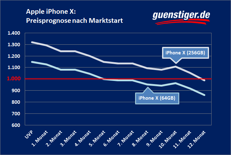 Zeichnet sich diese Entwicklung auch für das neue iPhone X ab, wird das Modell mit 64 GB nach fünf Monaten für 999 Euro erhältlich sein. Erst nach zwölf Monaten wird die Ersparnis 25 Prozent betragen. Zum selben Zeitpunkt wird dann auch das iPhone X 256 GB mit 989 Euro unter die 1.000er-Hürde fallen.