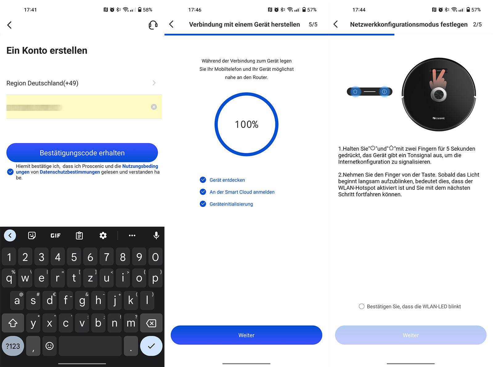Dann sollte (optional) die App installiert und eingerichtet werden. Dazu die Prosenic-App aus dem Playstore oder Applestore runterladen und sich per Mail registrieren. Nur so kann man später auch von unterwegs auf den Robo zugreifen und ihn gegebenenfalls auch mal außerplanmäßig von unterwegs starten oder überwachen.