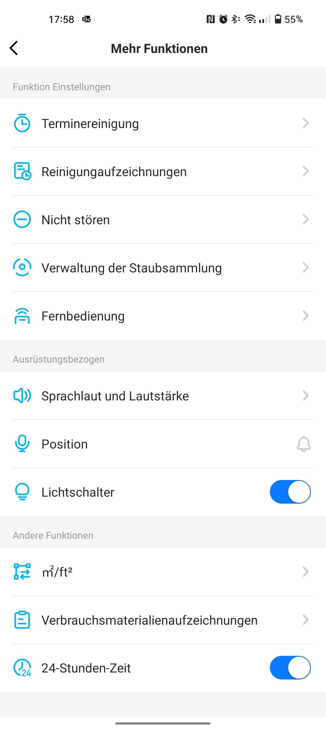 In der (teilweise nicht unbedingt gut übersetzen App – Lichtschalter statt Beleuchtung als Beispiel) findet man dann auch ein Protokoll über die bisher getätigten Reinigungsarbeiten. Also wieviele Quadratmeter abgefahren wurden und wie lange das gedauert hat etc.