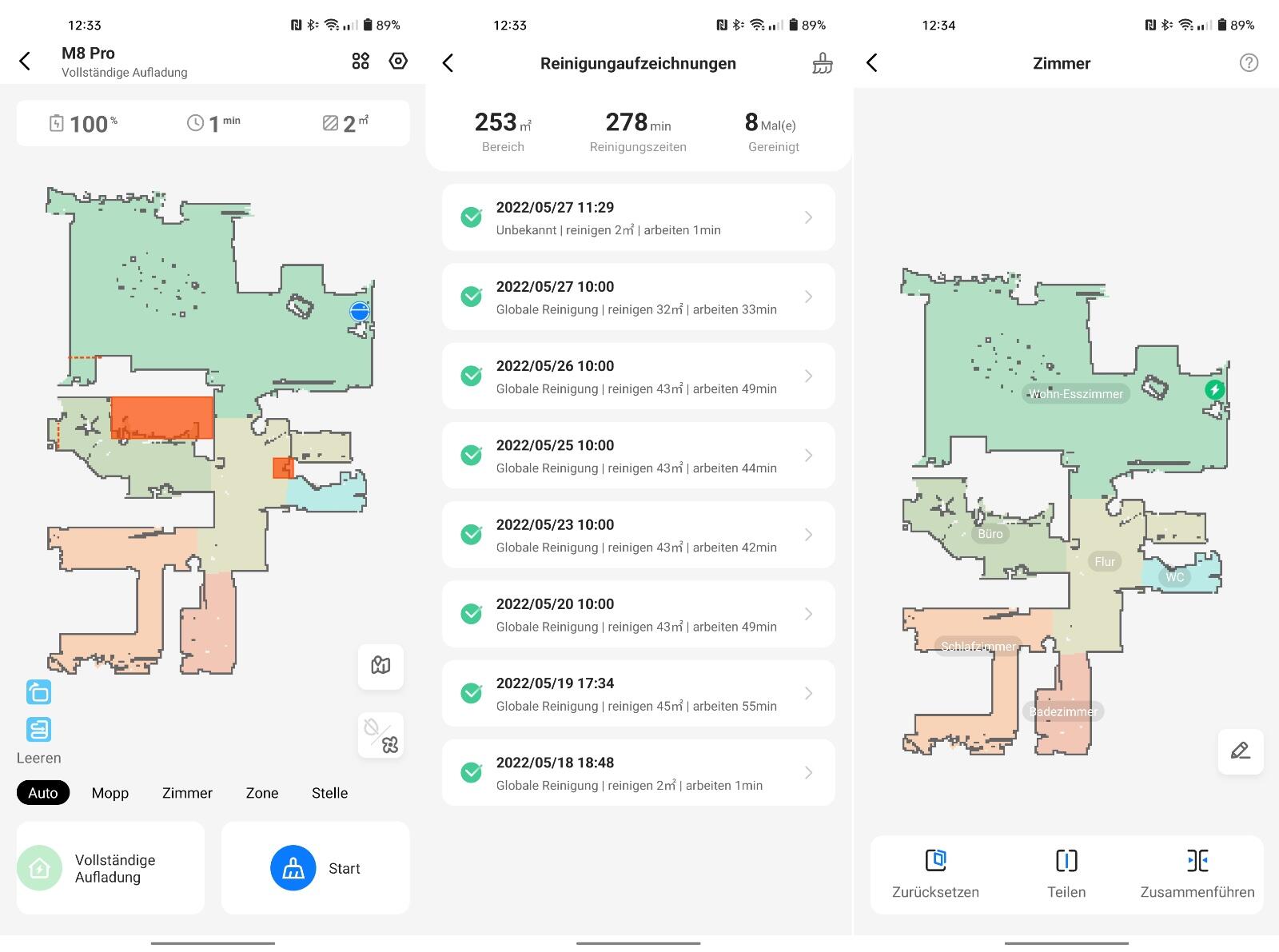 Auch sonst hat der M8 Pro noch viele weitere Features und Sensoren. Ein Sensor stellt die Saugleistung höher, wenn der Robo auf einen Teppich fährt, der nächste erkennt Treppen und verhindert einen Absturz etc. Das alles gehört mittlerweile für mich schon zum Standard. Zumindest in dieser Preisklasse.