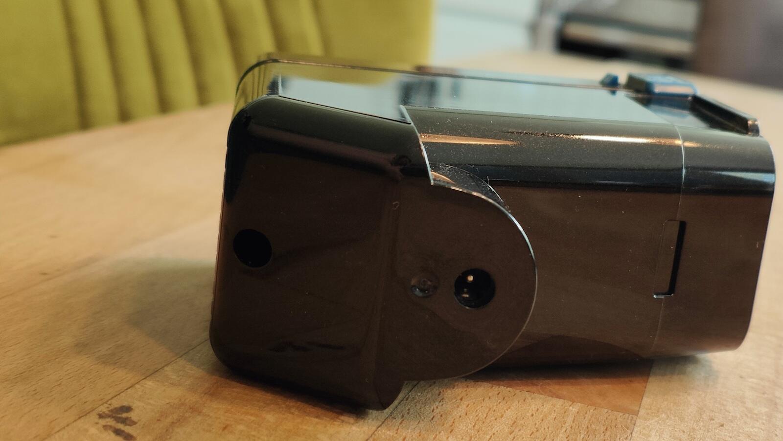 Der Schmutzbehälter hätte für meinen Geschmack ruhig ein wenig größer ausfallen dürfen. Vermutlich ist die Konstruktion ein Kompromiss aus Größe und Gewicht. Versteht mich nicht falsch – man kann problemlos saugen usw. Aber durch den geringen Platz um das silberne Element in der Mitte sammelt sich genau dort der längere Schmutz (Katzenhaare!) und bindet daran auch Teile des Weiteren eingesaugten Schmutzes. Die Klappe geht im Foto auf der rechten Seite auf, um den Inhalt entleeren zu können. Man muss also nicht selten in den Schmutz fassen, um die Haare/Schmutz dann am Ende doch händisch ausleeren zu müssen.