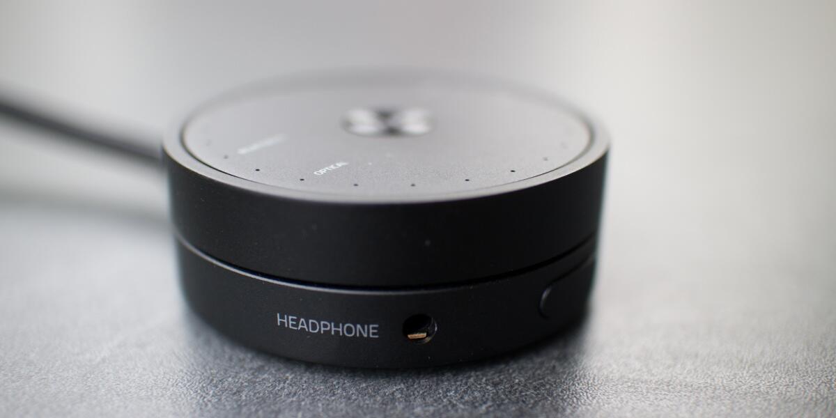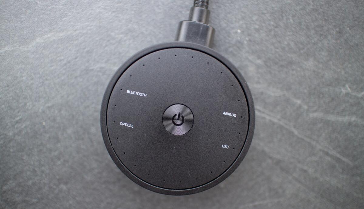 Doch der Razer Nommo Pro bietet noch mehr. Unter anderem einen wirklich praktischen und auch hochwertigen Control-Puck, der zur Steuerung der Medienwiedergabe einfach auf dem Schreibtisch platziert werden kann. Per Kabel ist er mit dem Subwoofer verbunden und ermöglicht unter anderem durch ein Drehen die Konfiguration der aktuellen Lautstärke. Zudem kann so schnell zwischen den verschiedenen Eingangsquellen gewechselt werden.