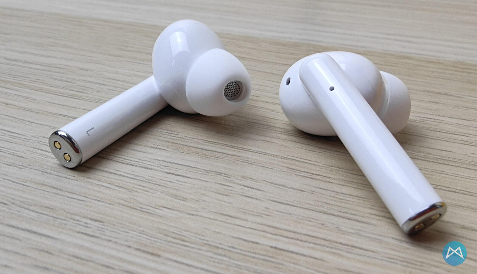 Die Stöpsel haben insgesamt drei verbaute Mikrofone. Zwei sind dafür gedacht, die Umgebungsgeräusche für das ANC (Active Noise Cancelling) herauszufiltern. Das dritte Mikrofon dient für die Stimmaufnahme für Gespräche. Auf der Unterseite befinden sich noch die zwei Ladekontakte.