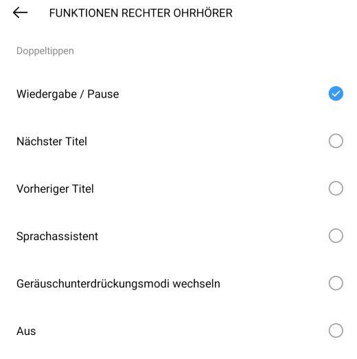 Über dem zweiten Mikrofon an der oberen Seite ist jeweils links und rechts eine Touch-Empfindliche Oberfläche. Hier können die Kopfhörer gesteuert werden. Was durch Doppeltippen oder Dreifachtippen geschehen soll, kann in der entsprechenden App auf dem Android Smartphone eingestellt werden: