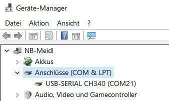 Wenn alles richtig erkannt wird, sollte unter Anschlüsse (COM & LPT) der Punkt USB-Serial CH340 im Geräte-Manager angezeigt werden. Dieser COM-Port muss dann auch in der Arduino-App ausgewählt werden. Dann klappt auch alles wie es soll.