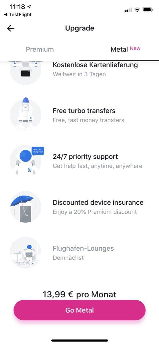 Dafür bekommen Kunden dann einen kleinen Cashback beim Einkauf (0,1% innerhalb der EU; 1,0% außerhalb), unbegrenzten Währungswechsel, bis zu 600 Euro Bargeldbezug monatlich kostenfrei, Turbo-Geldüberweisungen, besseren Support, Rabatt auf Geräteversicherungen, bessere Reiseversicherungen und in Kürze auch Zugang zu Flughafenlounges.