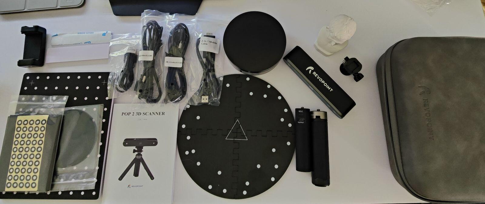In meinem Lieferumfang befindet sich der Pop2 3D-Scanner, ein Tripod, Quick-Setup Kits mit Markierungen etc., diverse USB-Kabel und Adapter, ein Smartphone-Halter, Scan-Plattformen und eine Kalibrierungs-Büste.