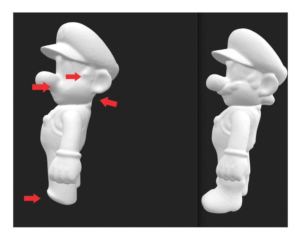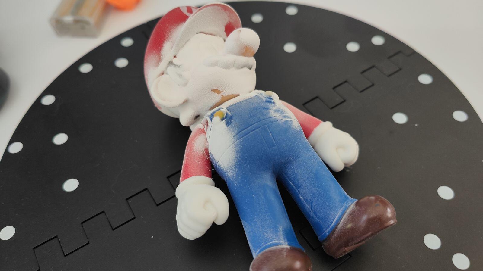 Links sieht man die Mario-Figur, welche an den Kotletten, dem Bart, den Haaren und den Schuhen (alles braun!) diverse Probleme hatte. Die Kamera erkannte nichts. Der Scan hatte dann in diesem Fall an diesen Stellen Löcher und im nächsten Schritt wurde dann in der App ein Mesh-Gitter über die bisher erkannte Form aus vielen einzelnen Punkten gelegt und dort enthaltene Löcher automatisch über die App geschlossen. Das klappte auch (siehe Figur links), aber entspricht leider nicht mehr dem Original. Nun kommt also das Trockenhaarshampoo ins Spiel. Den Ergebnis des Scans nach der Behandlung seht ihr dann am Scan rechts oben auf dem Foto! Nice, oder?!