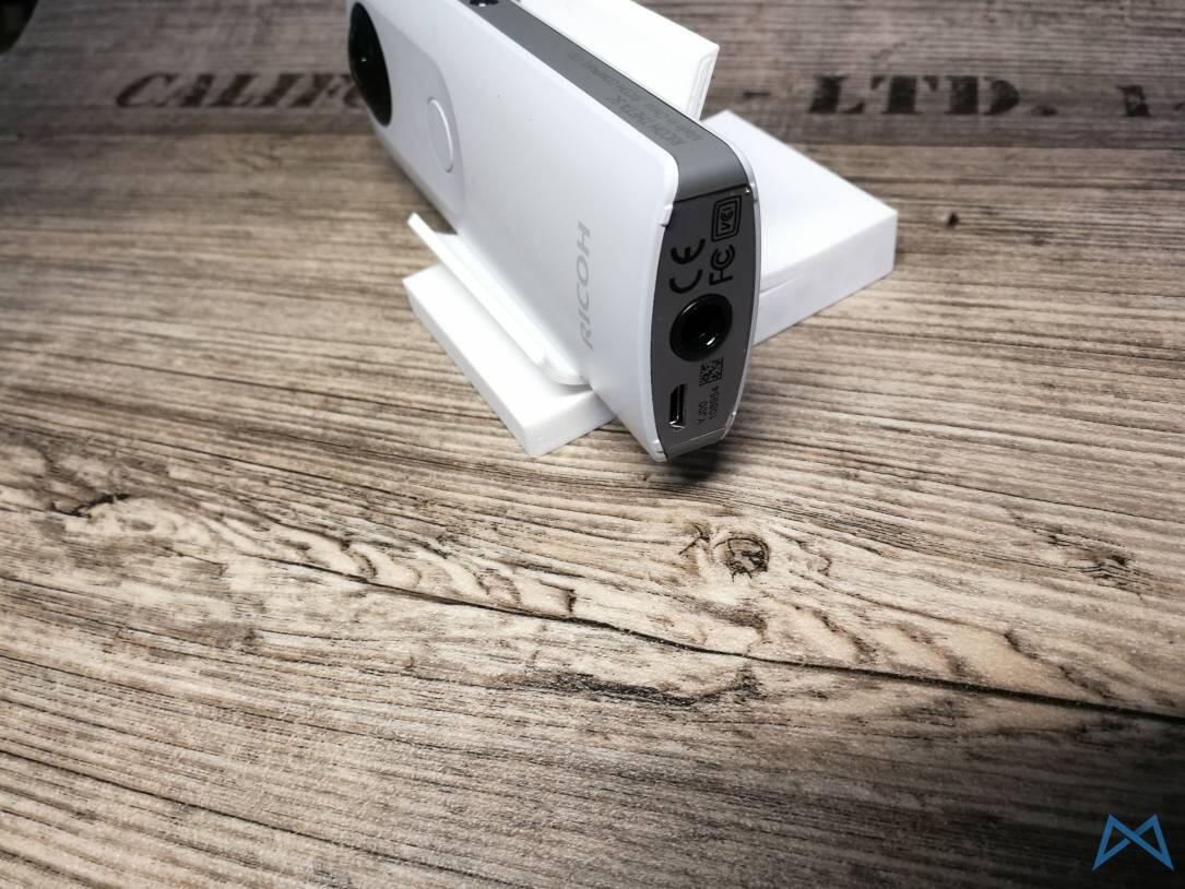 Videos nimmt die Theta SC übrigens in FullHD auf. Der MicroUSB-Anschluss ist auf der Unterseite – das bedeutet ein aufstellen der Kamera auf einen Tripod plus gleichzeitiges aufladen geht nicht. Die Videolänge ist dabei bei der Theta SC übrigens auf max. 5 Minuten statt 25 Minuten festgelegt. So betrachtet ist der MicroUSB-Anschluss auf der Unterseite auch nicht so schlimm, denn für 5 Minuten dürfte auch nur ein minimaler Akku noch genügen.