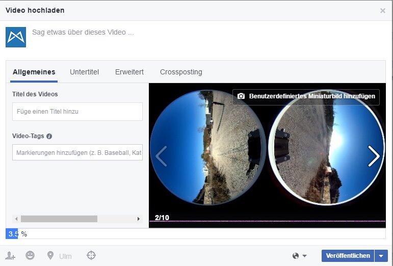 Ein weiteres Foto wurde hier auf unserem Facebook-Kanal öffentlich hochgeladen. An den Videos knabbere ich derzeit noch, da diese immer als MP4-File im Panoramaformat exportiert werden. Somit sind diese auf Youtube und Facebook nicht als Vollsphere frei schwenkbar. Je nachdem wie man vorgeht werden Videos auch als 2 Kugeln exportiert.