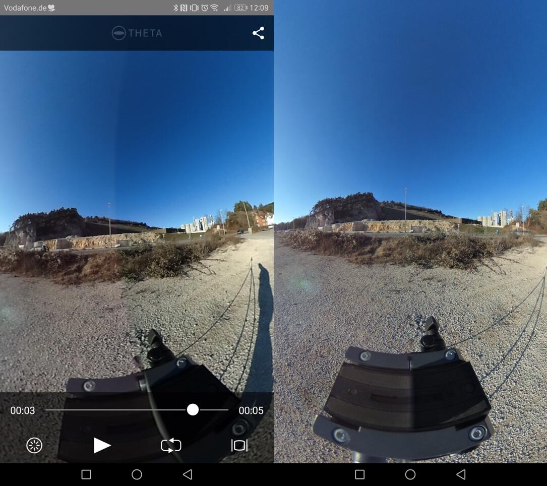 Die folgenden zwei Screenshots sind in der selben Situation entstanden. Einmal als Teil eines 360 Grad Fotos (rechts) und einmal als 360 Grad Video (links). Man sieht sehr schön auf der linken Seite, dass der Übergang von einer zur anderen Linse deutlich zu sehen ist. Im Falle des Fotos rechts ist die Software aber sehr gut programmiert und man muss schon deutlich hinsehen, um den Übergang zu finden.