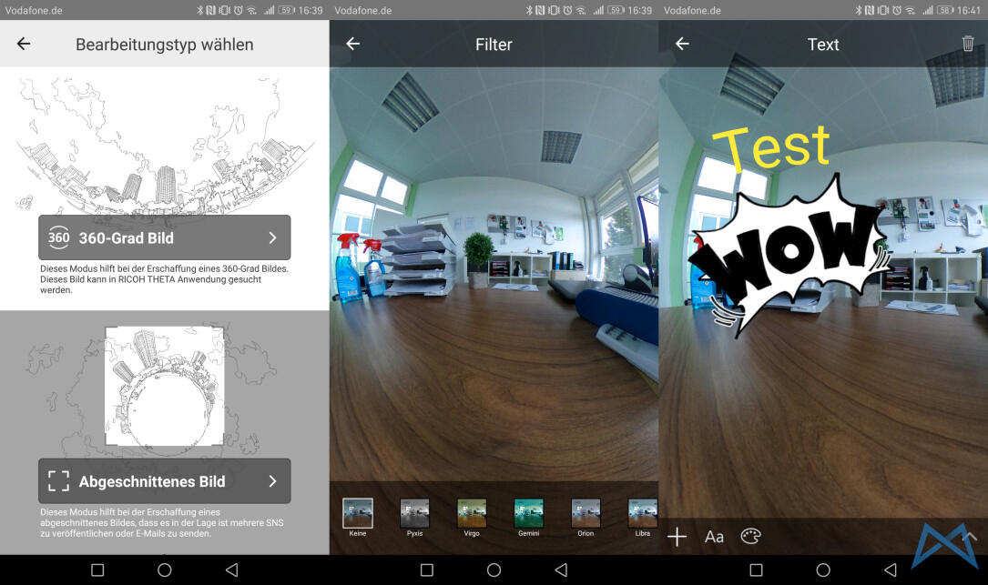 Noch einmal deutlich umfangreicher ist die restliche Möglichkeit der Bearbeitung eurer Fotos. Nach der Auswahl, ob man ein 360 Grad Foto oder aber einen ausgeschnittenen Bereich bearbeiten möchte, gelangt man in der App zu einer Auswahl, ob nun Filter oder Text bzw. Stempel hinzugefügt werden möchten.