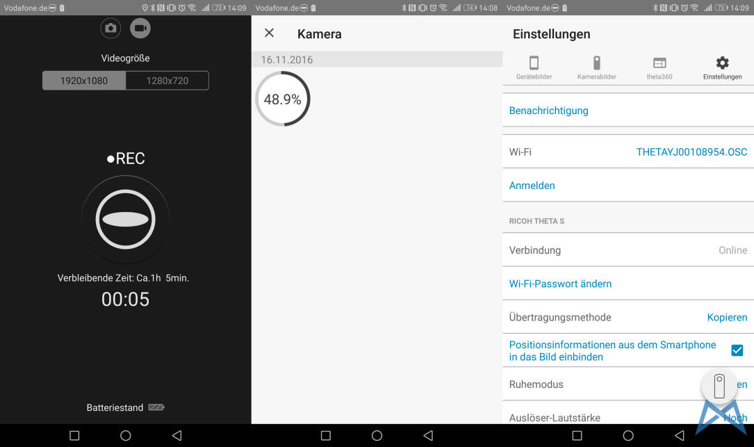 Die Einrichtung geht recht schnell von der Hand. Möchte man sinnvollerweise die Kamera mit dem Smartphone koppeln, muss die App hierfür installiert werden. Nach der Installation baut die Theta SC ihr WLAN auf und das Handy muss damit verbunden werden. Ein Teil der SSID ist das Passwort – das wird über die App auf dem Smartphone alles während des Startvorgangs angezeigt. Nach der Verbindung mit der Kamera kann es auch schon losgehen.