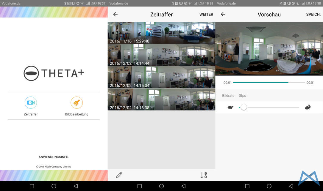 Die Anwendung Theta+ kann dann beispielsweise aus euren Videos und Fotos Zeitraffer erstellen. Hierfür wird lediglich das entsprechende Quellmaterial ausgewählt und schon kann es losgehen.