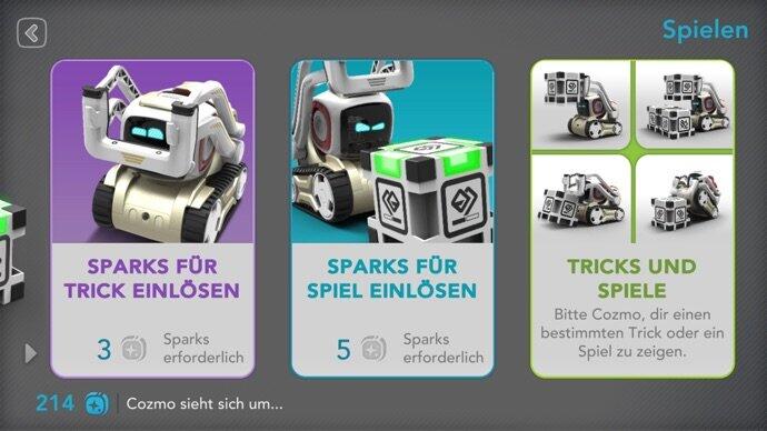 Ein bestimmtes Spiel spielen oder ein Kunststück machen kostet 3-5 Sparks. Das geht also in Ordnung, man wird nicht ständig knapp mit Zahlungsmittel werden. Außerdem verdient Cozmo mit spontanen Aktionen auch immer mal wieder 3-5 Sparks selbstständig.
