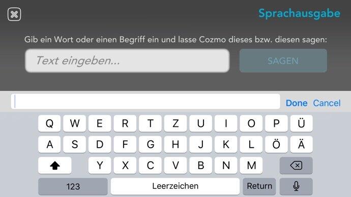 Die Option Sprachausgabe lässt euch Sätze per Tastatur eingeben, die Cozmo dann mit einer niedlichen Roboterstimme aufsagen kann. Die maximale Länge beträgt hier 31 Zeichen. Mehr als ein kurzer Satz ist also nicht drin. Diese Funktion erfordert keine Sparks, geht also immer.
