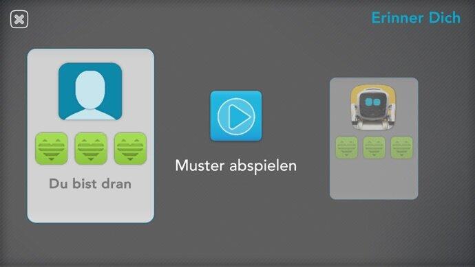 Erinner Dich: Merkspiel. Das Ziel lautet hier, sich eine möglichst lange Folge von aufleuchtenden Cubes zu merken. Man spielt alleine oder gegen Cozmo.