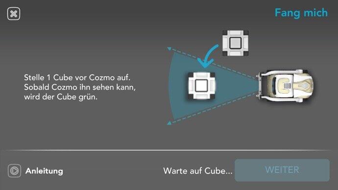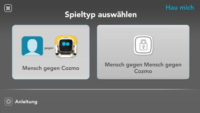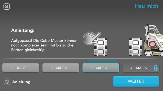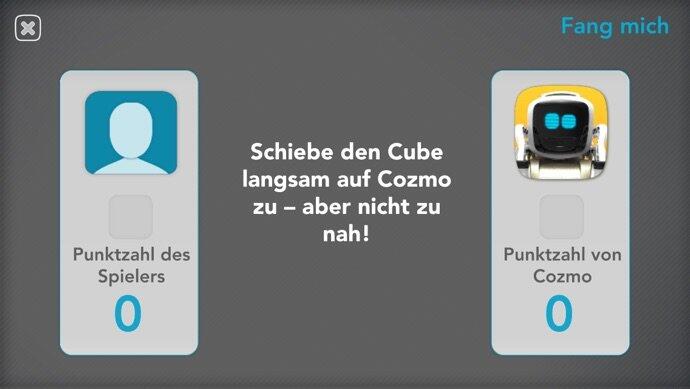 Fang mich: Hier spielt man alleine gegen Cozmo. Ziel ist es, den Würfel so schnell wegzuziehen, dass Cozmo nicht draufhauen kann. Gewinnt man hier einige Male, lernt Cozmo dazu und erhöht seine Reaktionsgeschwindigkeit.