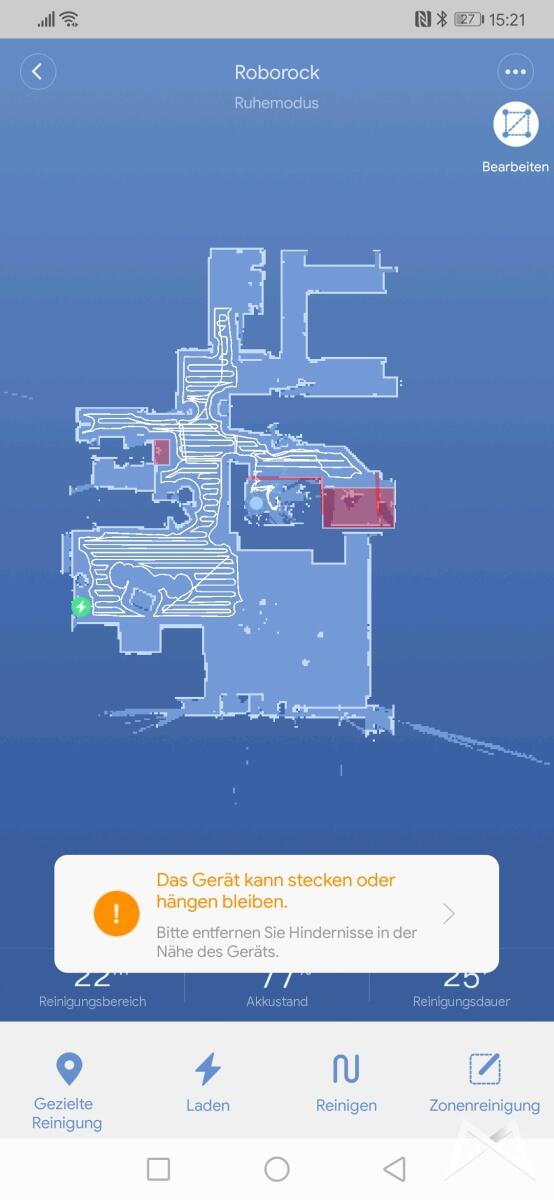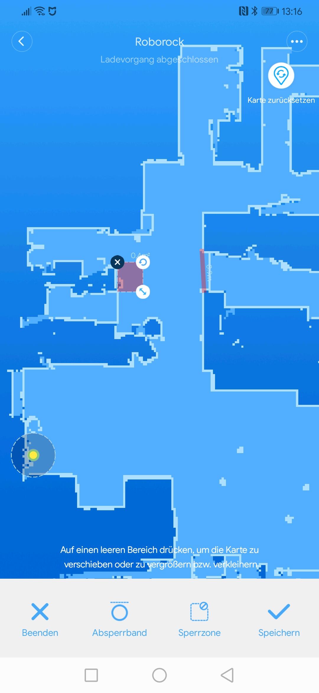 Einmal durch die Wohnung gehuscht lässt der Roborock es auch zu, einzelne Bereiche mittels virtueller Linien abzugrenzen und man kann auch ein kleines Kästchen auf Bereichen aufziehen, die ausgelassen werden sollen.