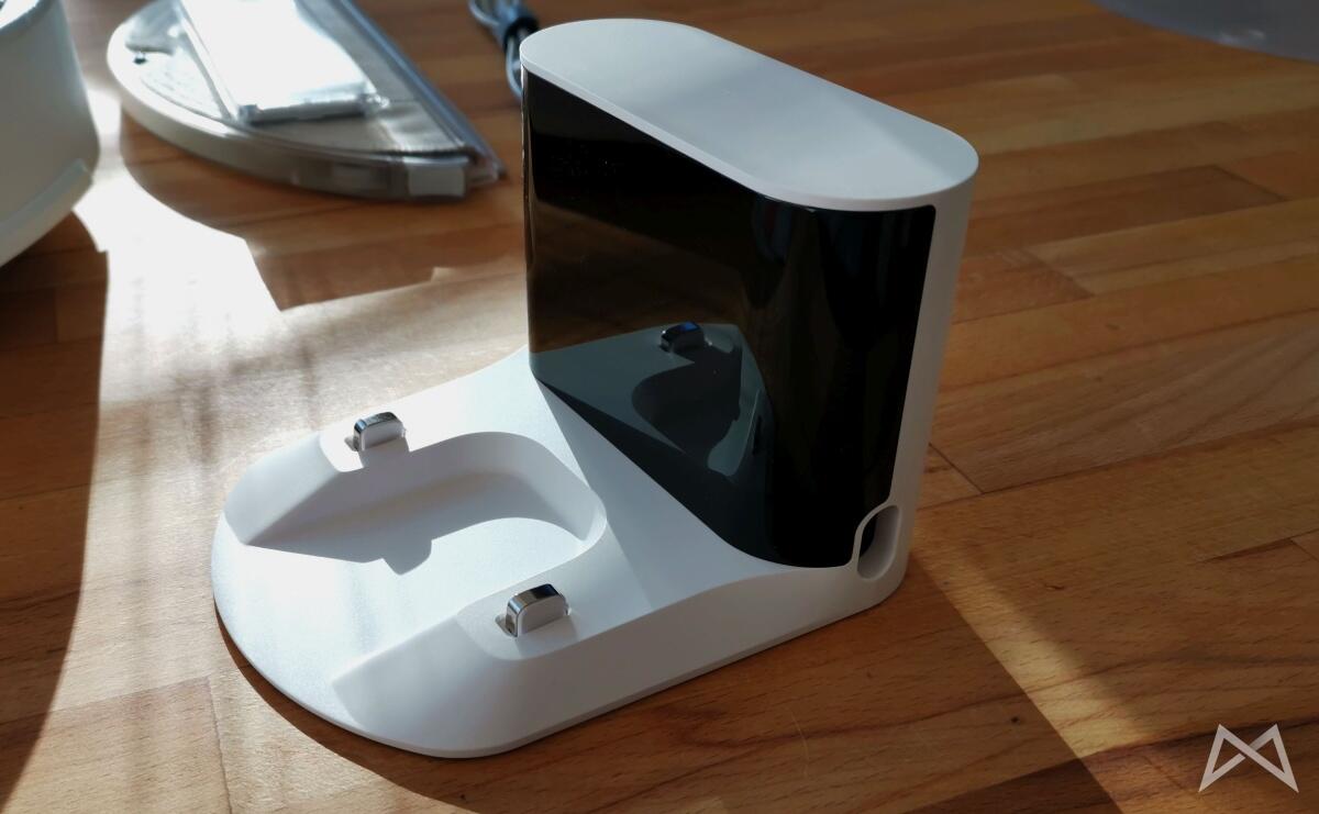 Die Ladestation gehört zu einer der kleinsten Stationen, welche ich bisher gesehen hatte. Vorausgesetzt man lässt die transparente kreisrunde Platte weg, welche etwaige Resttropfen Flüssigkeit aus dem Wischbehälter auffangen soll. Mit der Platte wird der benötigte Platz dann entsprechend größer.