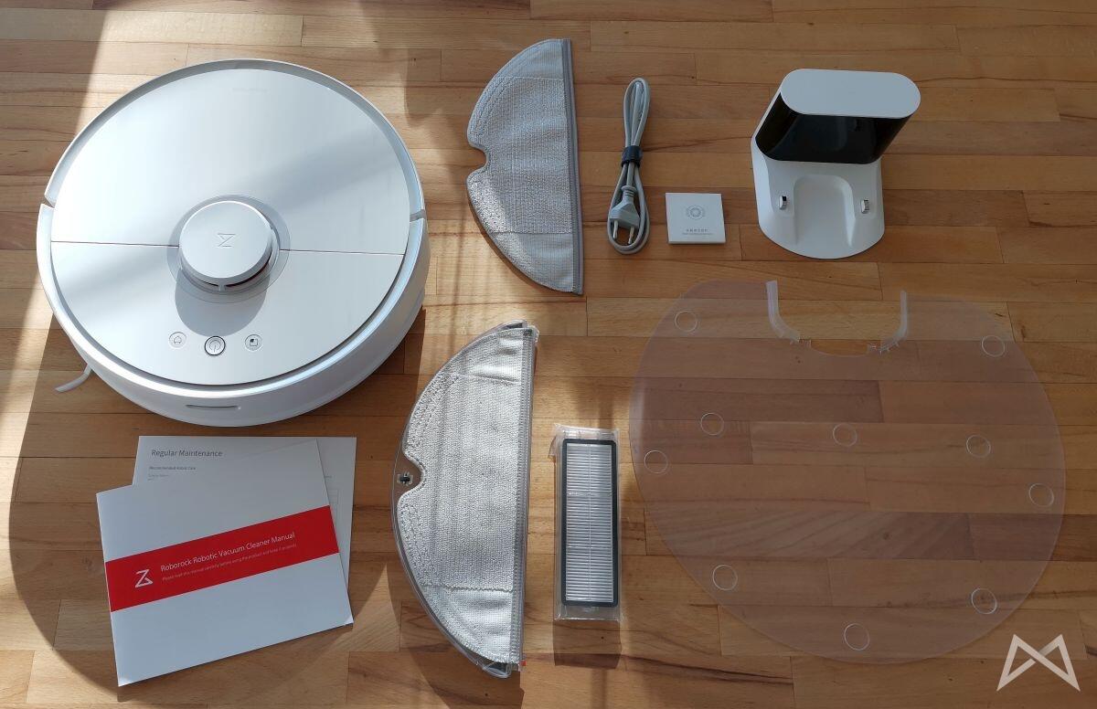 Auch der Roborock S50 ist Tetris-Like in einem Karton verpackt. Jedes Fleckchen wird elegant ausgenutzt und so finden wir im Karton natürlich den Saugroboter selbst, ein wenig Papierwerk, den Mop-Aufsatz inkl. zweier Möppe, einen Extra-Filter, Stromkabel, Filter für den Wischwasserbehälter und die Dockingstation mit optionaler Andockplatte.
