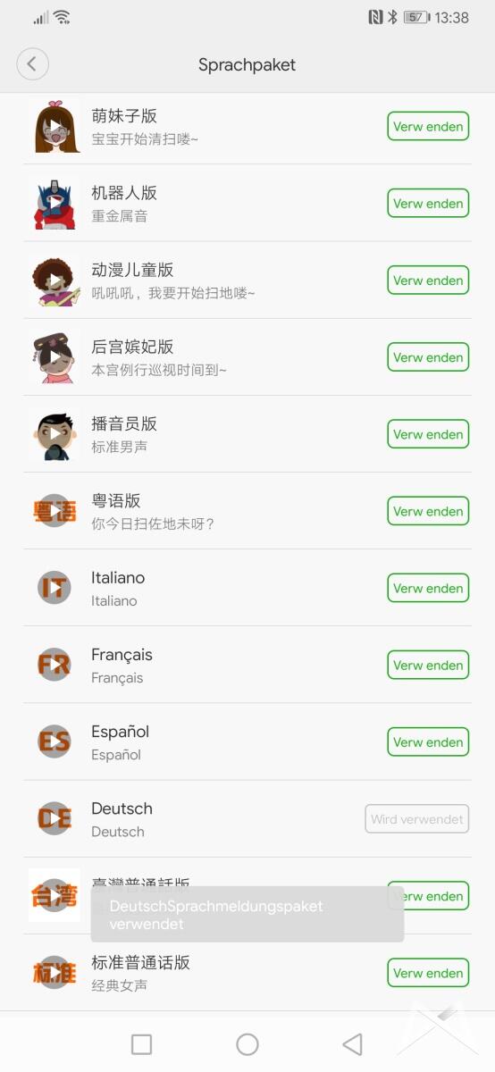 Anschließend wird in der App der Sauger gesucht, mit dem WLAN verbunden und schon kann die Reise losgehen. Etwaige Firmware-Updates werden geladen und installiert und man kann auch das Sprachpaket „Deutsch“ herunterladen und auswählen. Dann spricht der Robosauger seine Meldungen (Aufladen! Reinige! etc.) in Deutsch aus.