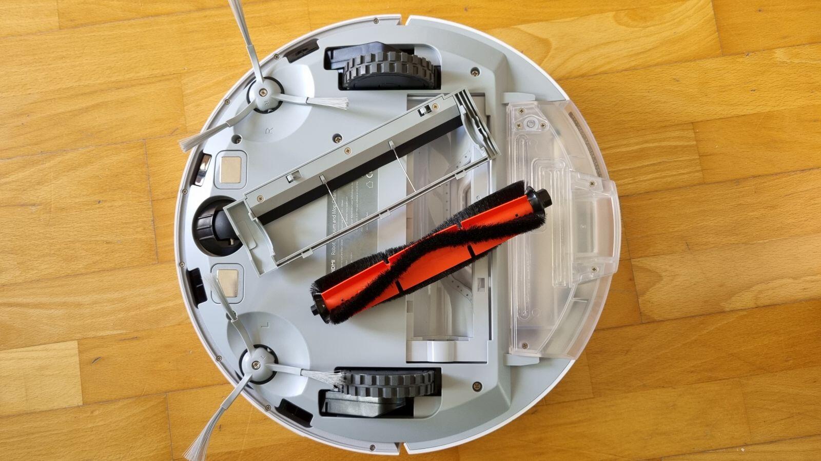 Der Behälter ist dabei federnd gelagert und wird durch den Sauger bei der Fahrt nach unten gedrückt. Man wird extra mittels Aufkleber auf dem Behälter darauf hingewiesen nur mit Wasser zu wischen und keine Reinigungsmittel zu nutzen.