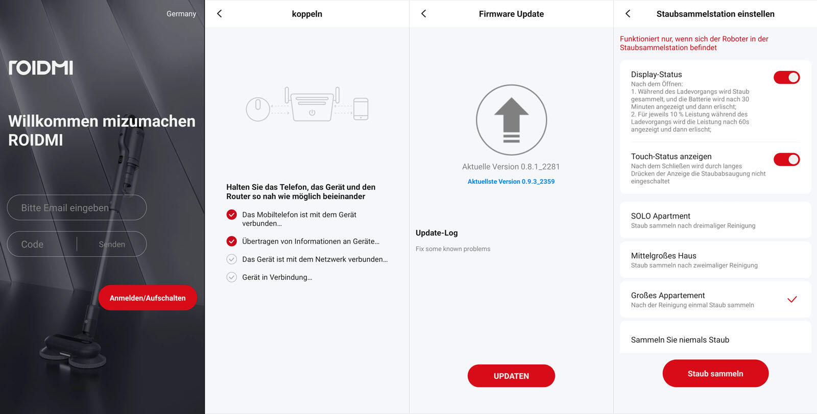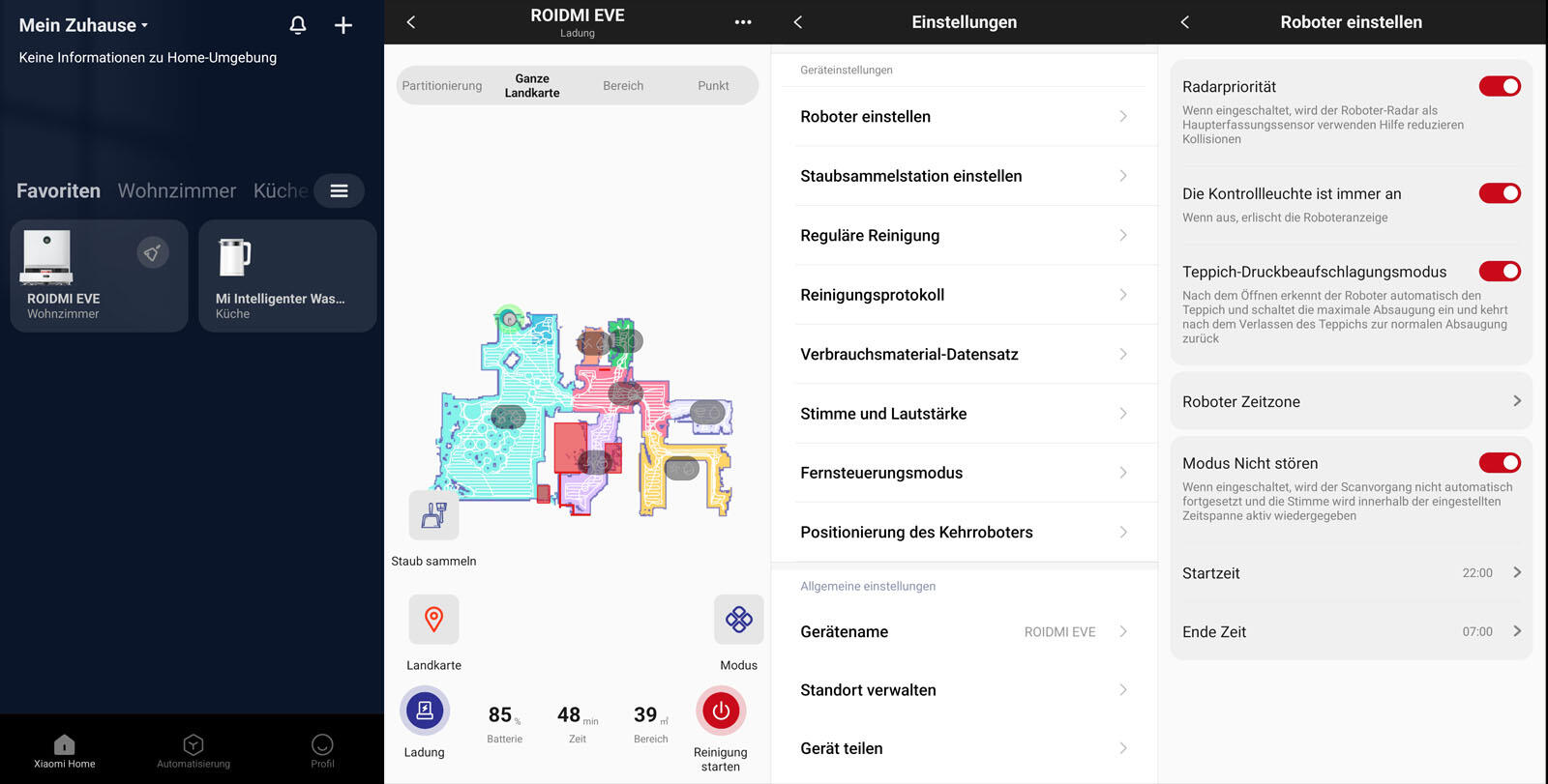 Deutlich eleganter geht das Ganze natürlich mittels App. Hierfür wird entweder die Roidmi-App oder aber die Xiaomi-App geladen und installiert. Eve arbeitet mit beiden Apps hervorragend zusammen. Es gibt hier und da etwas holprig übersetzte Wörter, aber das sollte während der Bedienung nicht stören.