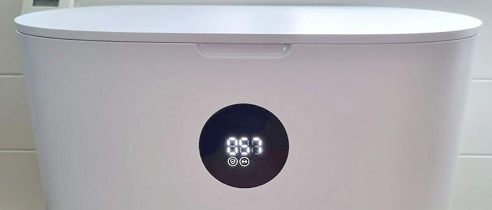 Die Absaugstation ist ebenfalls gut verbaut. Auf der Vorderseite finden wir einen kleinen runden Touchscreen, der uns mit den nötigsten Infos versorgt. Beispielsweise den Akkustand während des Ladevorgangs oder ob die gute Eve mit WLAN verbunden ist usw. Durch den Touchscreen kann dann beispielsweise auch der Absaugvorgang gestartet werden.