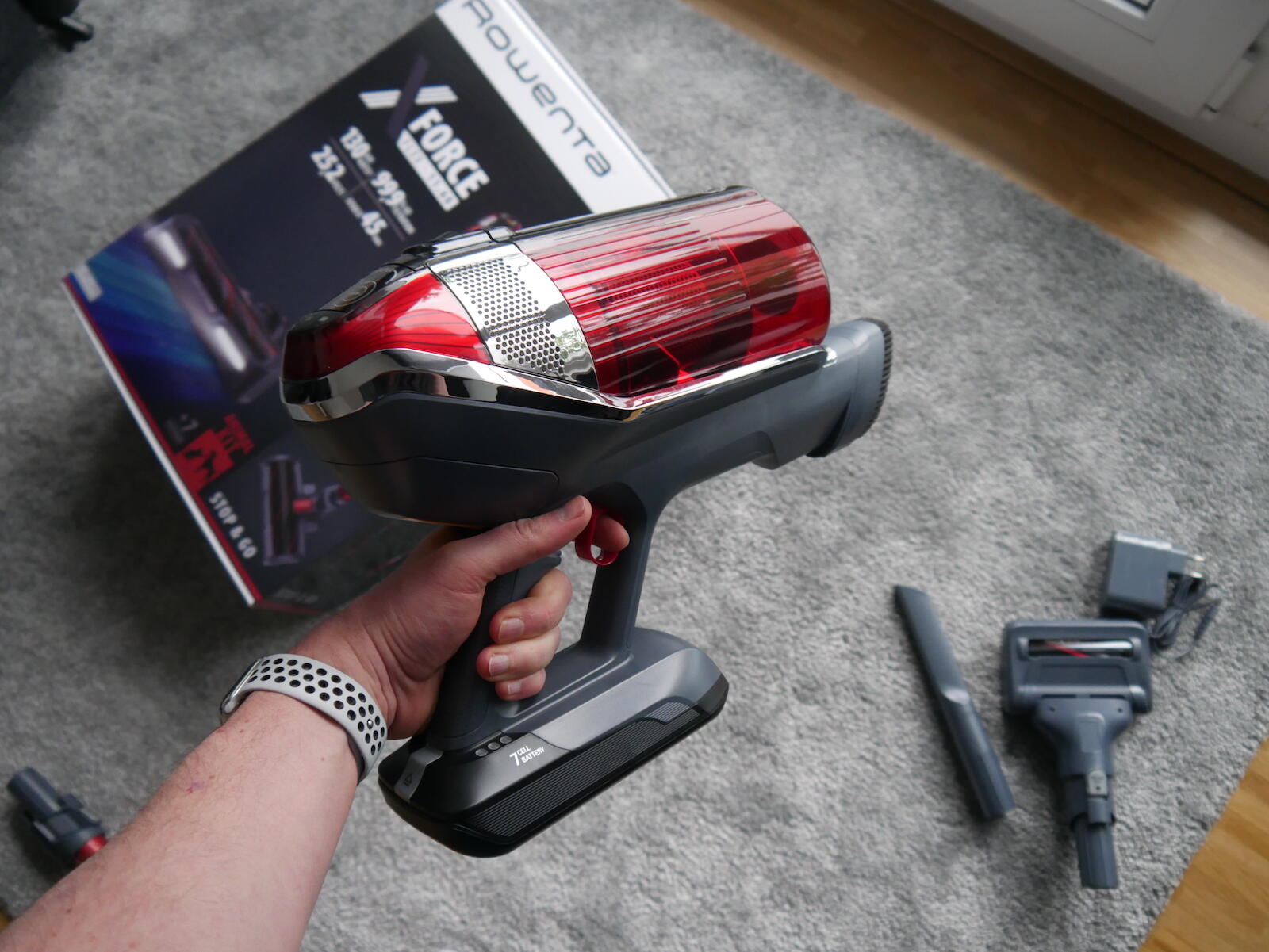 Fangen wir mit den Basics an: Der Rowenta X-Force Flex 11.60 besitzt 130 Air Watt Saugleistung, eine Akkulaufzeit von knapp 45 Minuten, es gibt mehrere Saugmodi, ein kleines Display, welches Informationen anzeigt, einen Saugbehälter, der fast 1 Liter aufnehmen kann und den man (wie die Filter) mit Wasser reinigen kann.