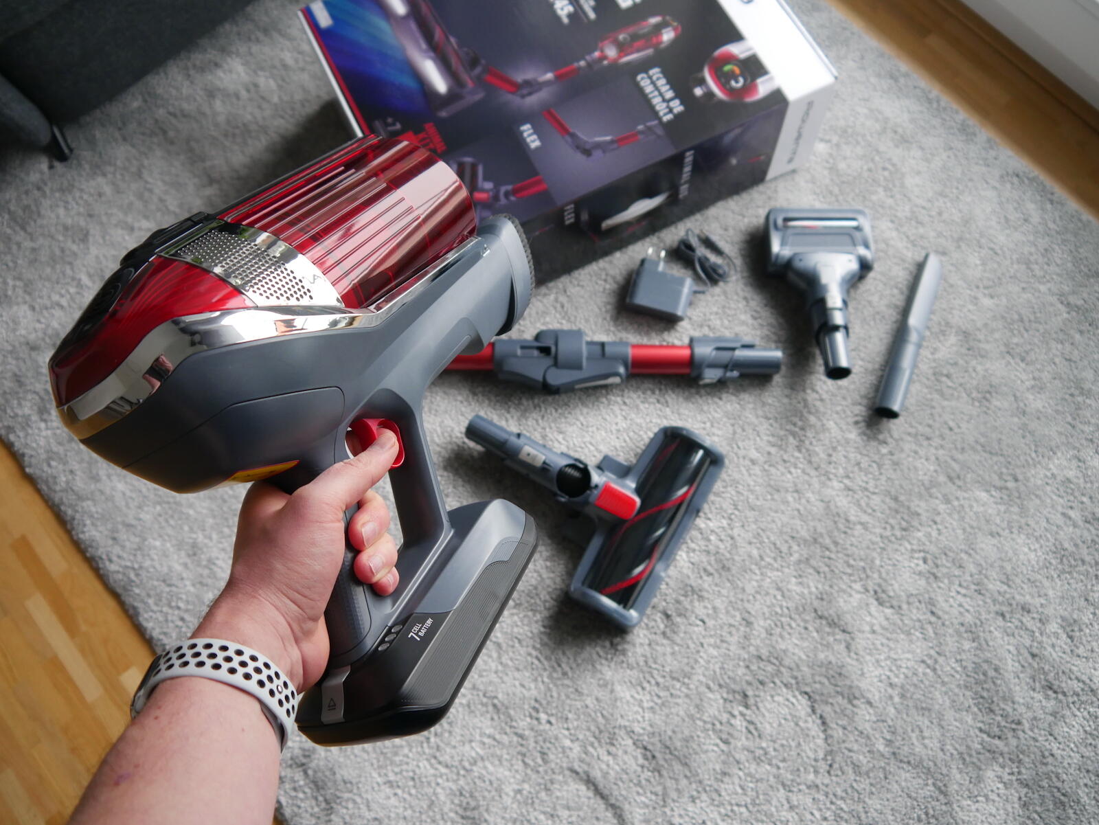 Das Display auf dem Rowenta X-Force Flex 11.60 ist praktisch und zeigt das an, was man benötigt. Die Aufsätze lassen sich leicht wechseln und das flexible Rohr kann ich auch mit einer Hand „aktivieren“. Eine Halterung für die Wand ist übrigens auch dabei und sie lädt den Sauger, wenn er darin hängt. Allerdings geht das mit dem Kabel nicht ohne die Halterung, da muss man dann den Akku entnehmen.