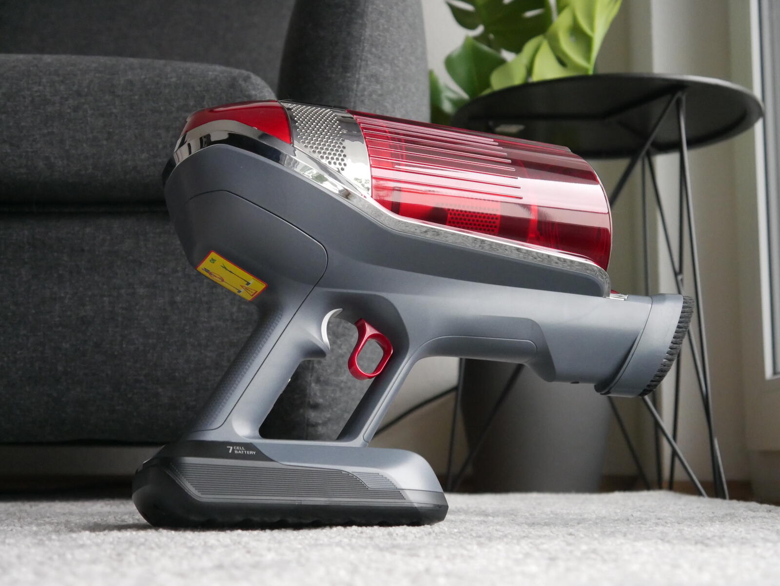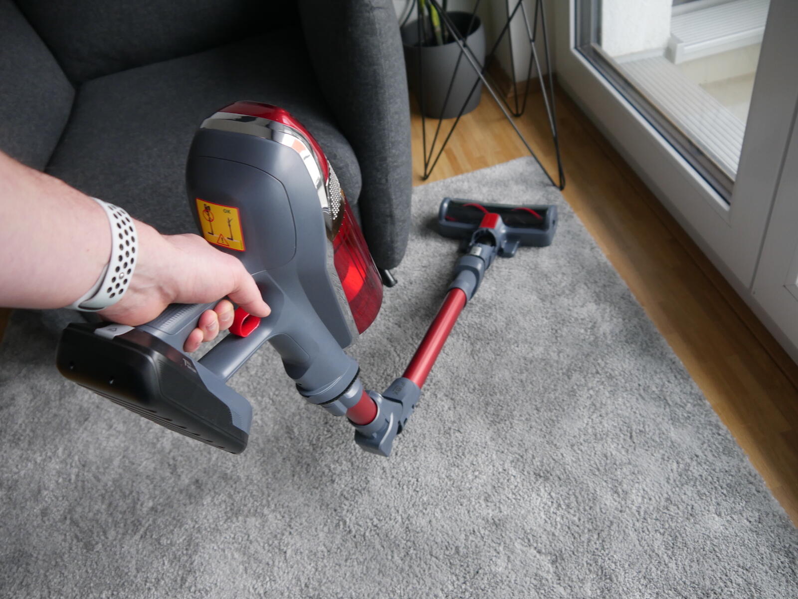 Wo wir gerade dabei sind und was mir gefällt: Man startet den Sauger mit einer Taste und drückt diese, wenn man fertig ist. Man muss also nicht dauerhaft die Taste beim Saugen drücken. Es gibt aber noch eine Taste zum Drücken und diese aktiviert einen Boost-Modus, den man dann auf einem Teppich nutzen kann.