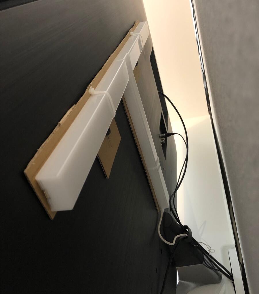 1.200 Lumen Helligkeit schafft man mit sechs dieser Leisten und ballert dabei 34 Watt weg. Ich habe am Ende nur drei Leisten genutzt. Diese habe ich allerdings nicht direkt an die Rückseite des TVs geklebt, sondern ich habe mir aus einem stabilen Karton eine Art Halterung geschnitten, auf der habe ich die Leisten aufgeklebt und mit Kabelbindern fixiert.