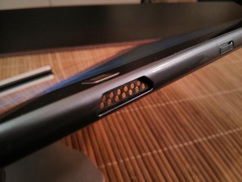 Insgesamt liegt das Tablet recht gut in der Hand, was vor allem am vergleichsweise geringen Gewicht liegt. Hier macht sich der eingesetzte Kunststoff wieder bezahlt. 16:9-Tablets dieser Größenordnung haben es hier meiner Meinung nach nicht wirklich einfach, wenn es um Dinge, wie die Handlichkeit des Gerätes geht. Samsung hat aber genau das relativ gut geschafft. Im Prinzip lässt sich sagen, dass die Hardware des ATIV Tab ein Kompromiss ist: Nicht wirklich hochwertig, dafür aber eben leicht und handlich.