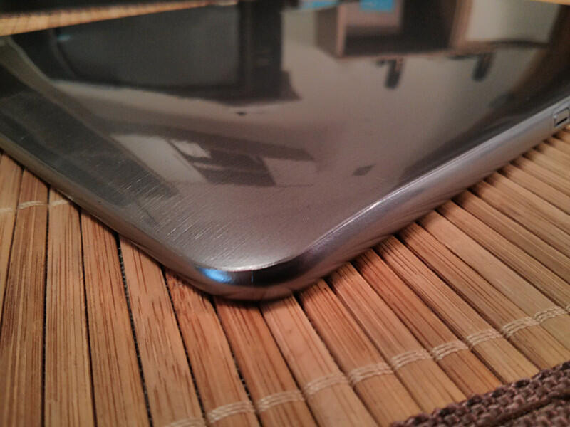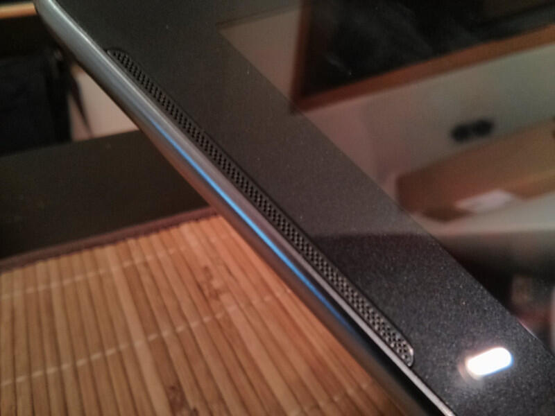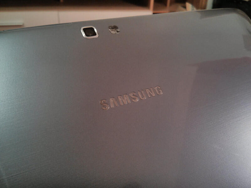 Das ATIV Tab ist ein typisches Samsung-Tablet mit der bekannten Form, den auffälligen Front-Lautsprechern und auch der Kunststoff-Rückseite, die man z.B. vom Samsung Galaxy S3 kennt: Glattes, glänzendes Polycarbonat, das auf den Look von gebürstetem Aluminium getrimmt ist. Ich habe es bereits im ersten Bericht angesprochen und meine Meinung hat sich seitdem nicht geändert: Die Rückseite will mir gar nicht zusagen. Sicherlich ist das Tablet durch den Einsatz von Polycarbonat recht leicht, allerdings geht das zu Lasten der Haptik. Es fühlt sich einfach nicht wie ein, dem Preis entsprechendes, hochwertiges Tablet an. Die Vorderseite hingegen gefällt. Dadurch, dass die Lautsprecher an der Vorderseite angebracht sind, kann sich Samsung mit diesem hübschen Detail absetzen und sieht von vorne nicht aus, wie jedes andere Tablet.