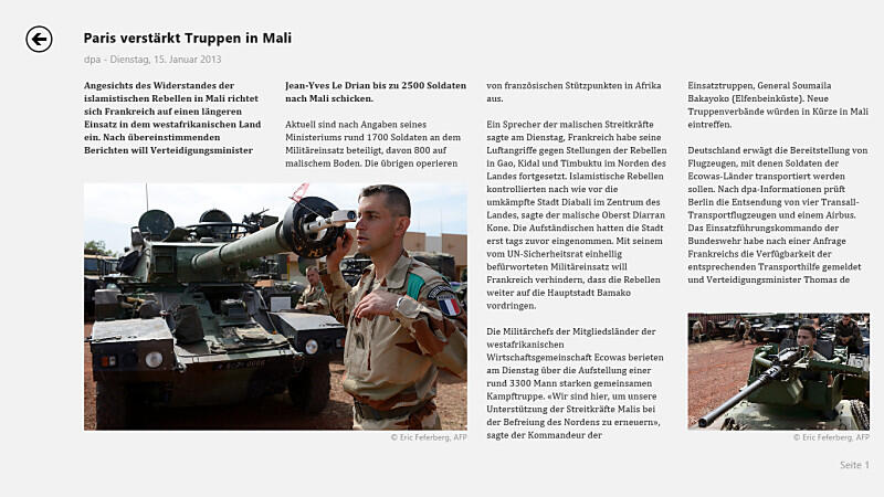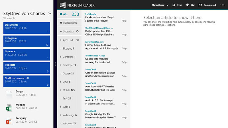 Viel Spaß macht auch das Surfen mit dem Tablet. Internet Exlorer 10 ist unter der Modern UI ein toller Browser: Schnell, zuverlässig, mit durchdachten Funktionen ausgestattet und auch die Darstellung von Webseiten klappt überraschend gut. Genauso klasse sind auch andere vorinstalliert Apps. Die News-App iist für mich z.B. ein Padaradebeispiel dafür, wie eine gute Nachrichten-Applikation auszusehen hat, denn die Artikel sind schlichtweg toll aufbereitet. Lesen macht so eine Menge Spaß.