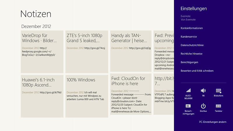 Auf dem Tablet läuft Windows RT, sozusagen die Tablet-Version von Windows 8. Bereits im Vorfeld hätte ich darauf gewettet, dass die neue Modern-UI riesigen Spaß auf einem Tablet macht und genau das ist auch der Fall. Die, auf Gesten ausgelegte, Navigation durch System und Apps macht Spaß, das Andocken einer zweiten App als Seitenleiste neben einer anderen Applikation ist im Feld der Tablet-Betriebssysteme revolutionär und eröffnet ganz neue Möglichkeiten. Man will die Email-Inbox nebenbei im Blick behalten, während man sich in einer anderen App aufhält? Alles kein Problem! Microsoft ist hier definitiv auf dem richtigen Weg.