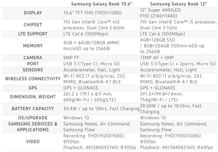 Das Samsung Galaxy Book ist ein Windows-10-Tablet, welches mit einer Tastatur und einem neuen S Pen daher kommt. Das Galaxy Book kommt zur Jahresmitte in zwei Größen auf den Markt und zwar in 12 Zoll sowie 10,6 Zoll. Die Eckdaten der beiden Geräte unterschieden sich dabei etwas. In der 10,6-Zoll-Version werkelt ein Intel Core m3 Dual-Core-Prozessor der 7. Generation mit 2,6 GHz, dem 4 GB RAM sowie 64 GB bzw. 128 GB interner Speicher (eMMC +microSD-Slot) zur Seite stehen.