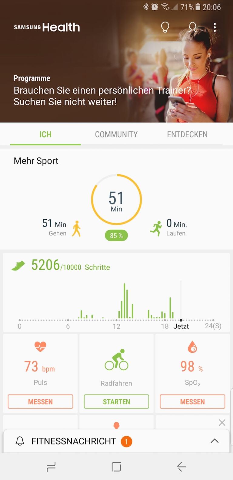 Samsung hat im Bereich Fitness beim Note 8 auch wieder den Fitness-Assistenten SHealth an Bord. Dies bedeutet, dass alle gesammelten Daten ausgewertet und analysiert werden. SHealth spornt einen auch an z.B. mehr zu laufen, in dem ab und zu eine Benachrichtigung aufploppt, die einem sagt, dass man doch mal wieder laufen soll. Vielleicht auch mal weiter, als nur bis zur Kaffee-Maschine. :)