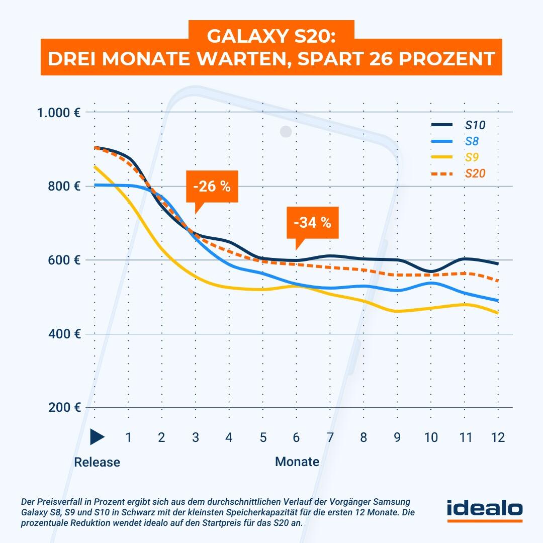 Nach drei Monaten lagen S8, S9 und S10 durchschnittlich 26 Prozent unter dem Startpreis. S8+, S9+ und S10+ waren „gerade mal“ 19 Prozent günstiger. Je nachdem wie teuer die Geräte letztlich zum Start sind, macht das bei der neuen S20 Serie rund 200 bis 250 Euro aus.